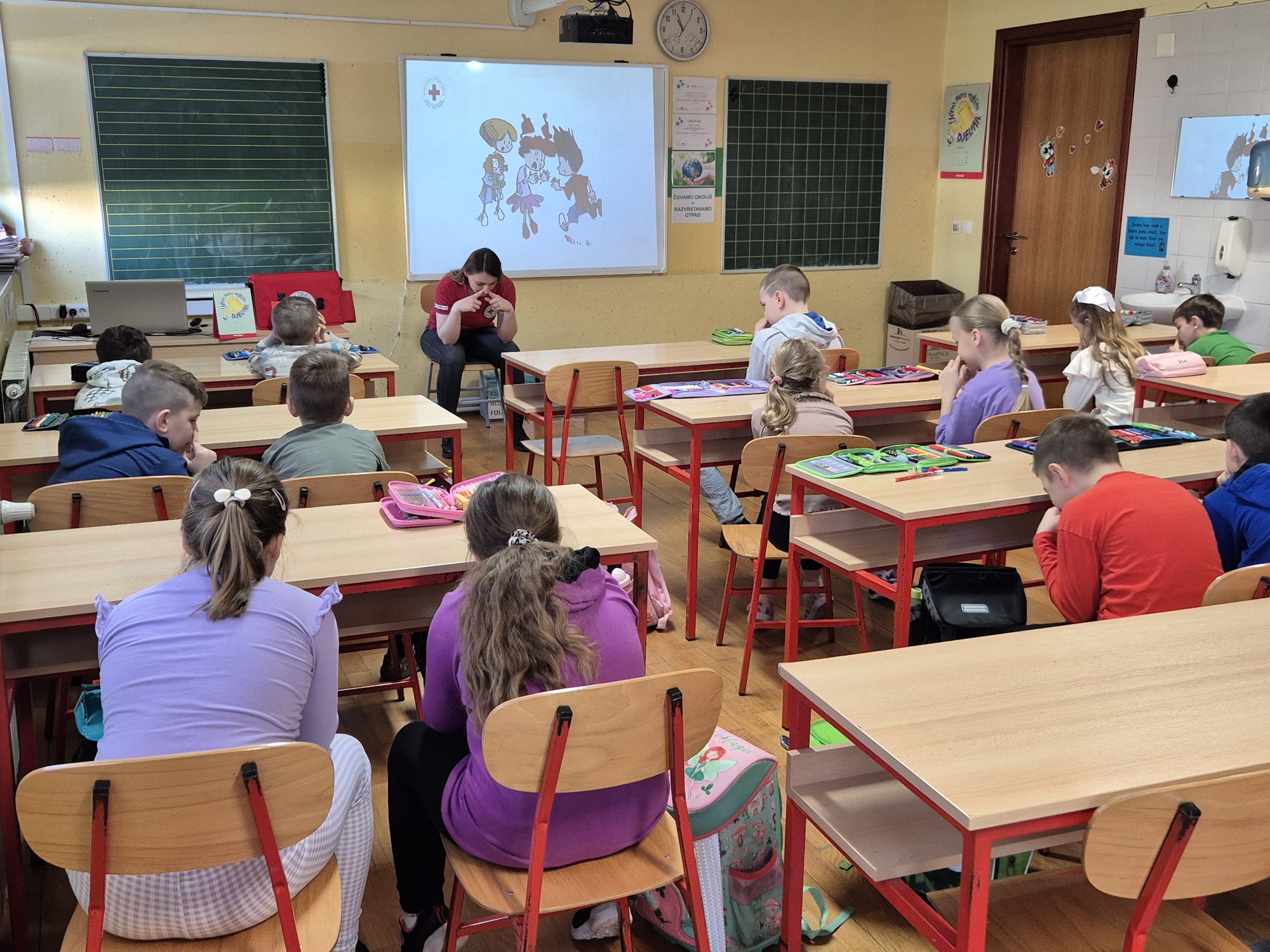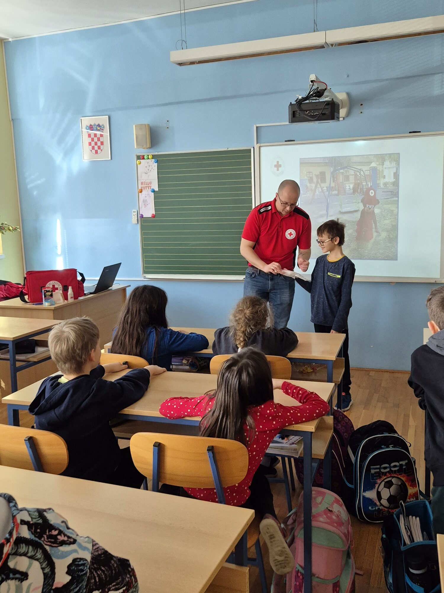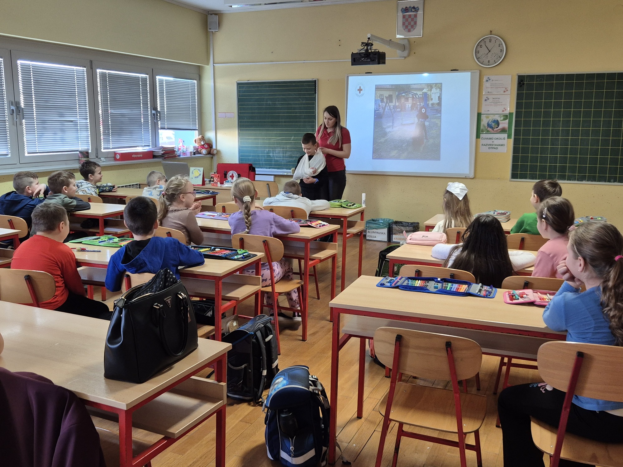 S učenicima 2. razreda proveli smo radionice „Pomozi prijatelju“, tijekom kojih smo ih upoznali s osnovama pružanja prve pomoći. Kroz interaktivne i praktične aktivnosti učenici su učili kako reagirati u slučaju manjih ozljeda, kako pravilno očistiti i previti ranu te kako ostati smiren i pružiti podršku ozlijeđenoj osobi. Posebno su bili zainteresirani za praktični dio radionice u kojem su imali priliku upoznati sadržaj torbice prve pomoći te samostalno isprobati korištenje zavoja, gaza i flastera uz stručno vodstvo.